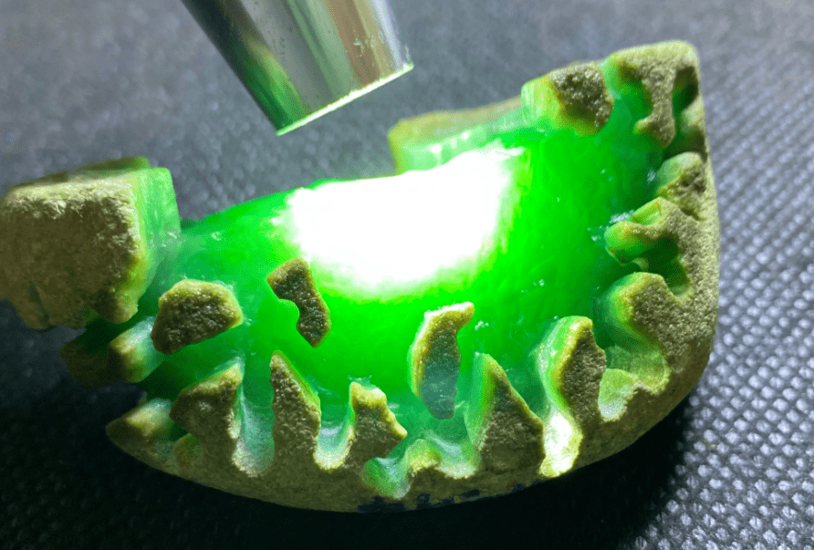 玉石和翡翠的斷口是不一樣的。 玉石的斷口比較均勻,呈現給人的是一種玻璃般的質感。 而翡翠因為所含礦物的不同,斷口可能會呈現出纖維狀、片狀或網狀的紋理。