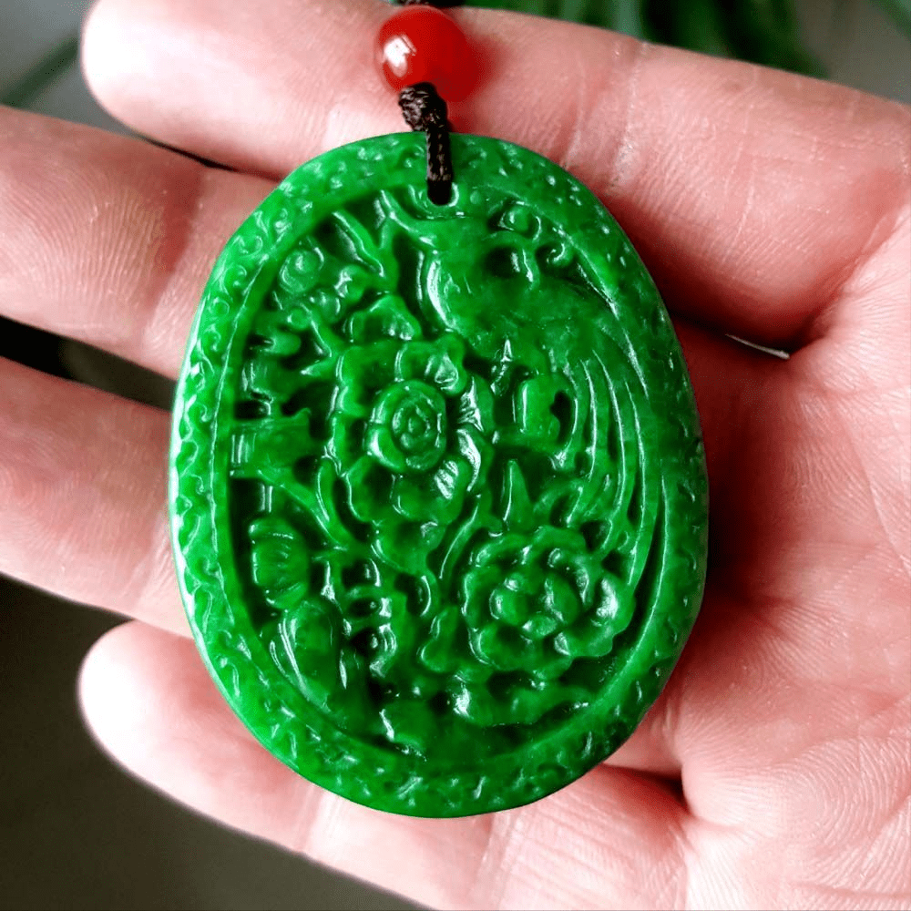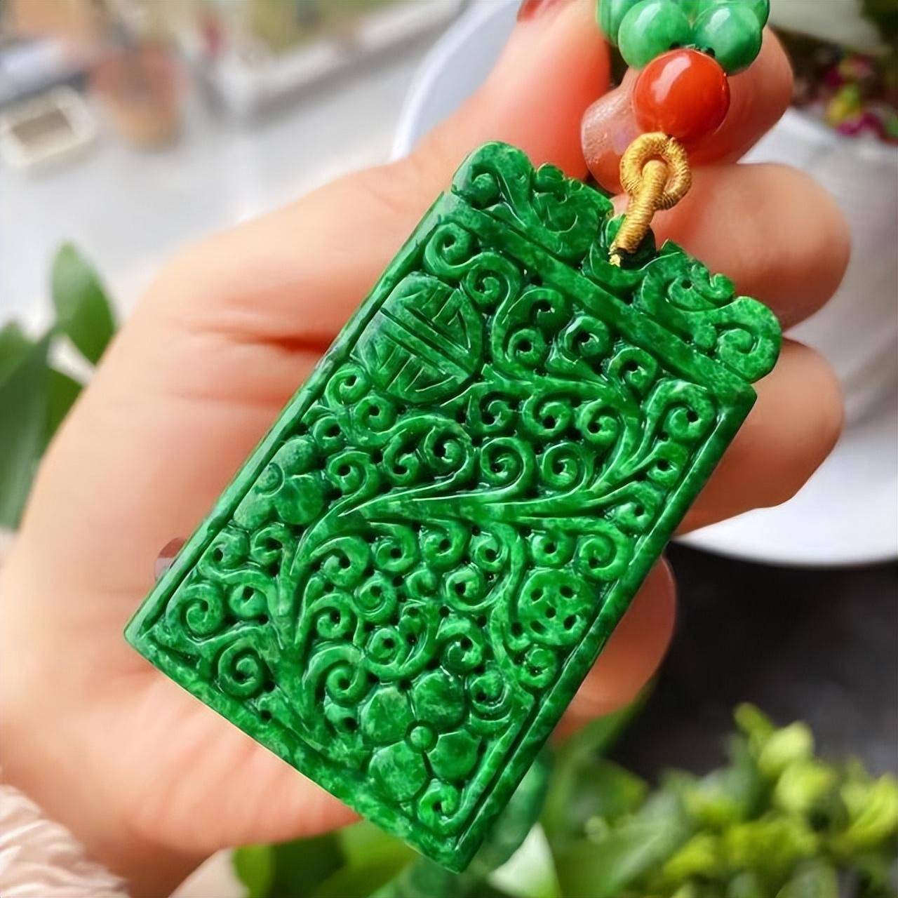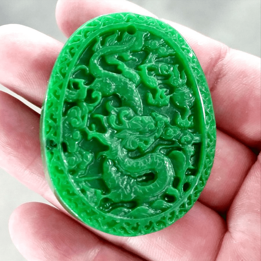 而鐵龍生翡翠表面顏色綠且鮮豔,或是呈現墨綠色,或者是墨綠色和黑色的區間,其肉質相對來說還是比較細膩的,而且還有一定的水頭,絕大多數的鐵龍生都是以薄片形式存在的,但是它和干青有所不同,干青是沒有光透感,但是鐵龍生是有一定的光感和透感的,而且看著油光發亮。