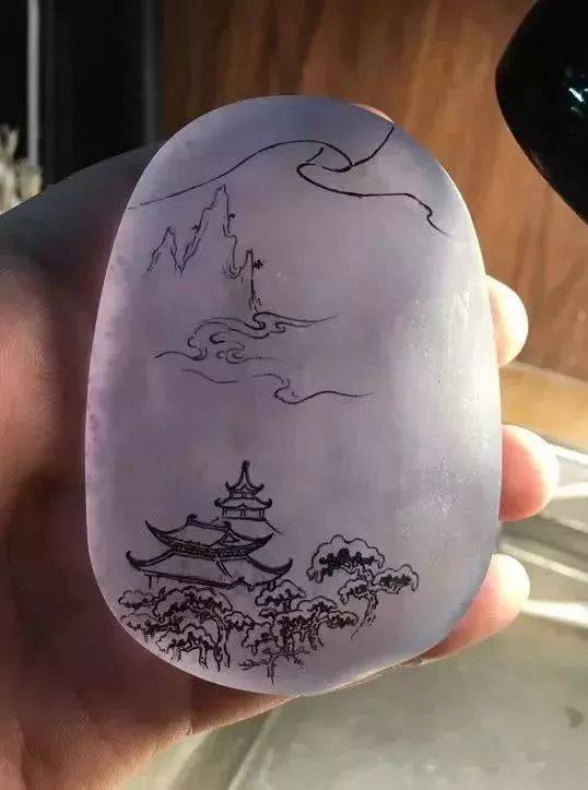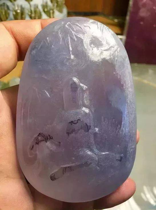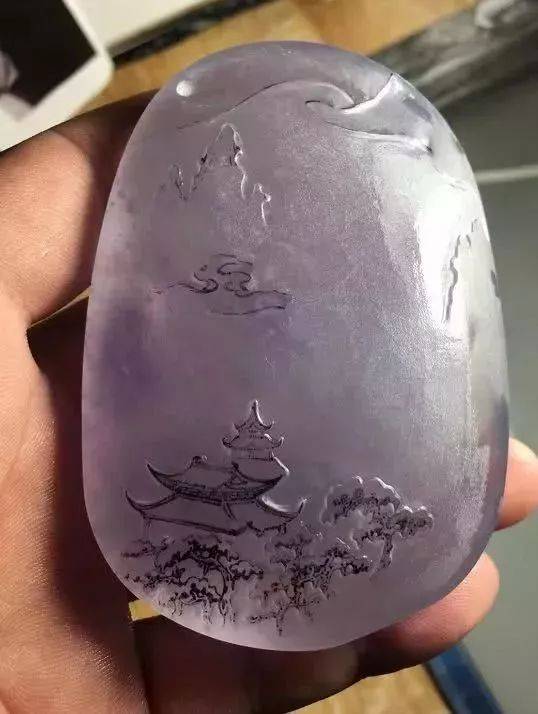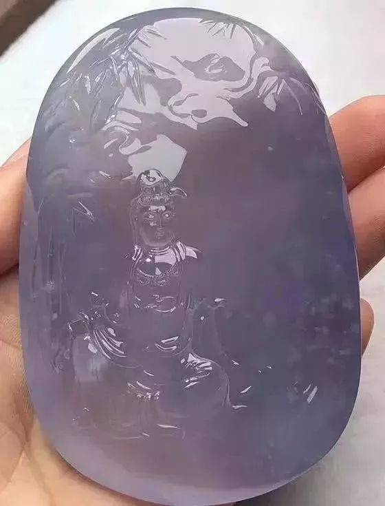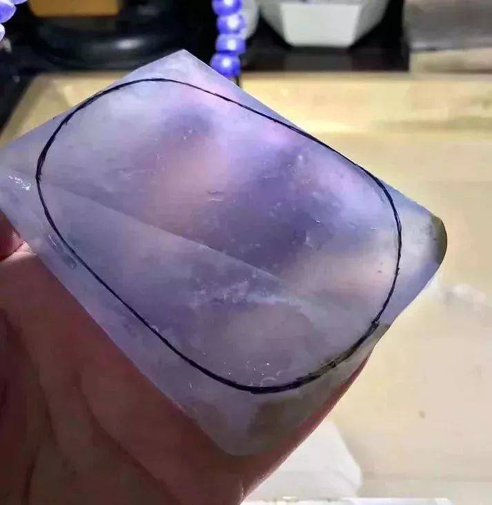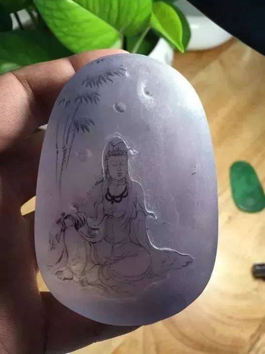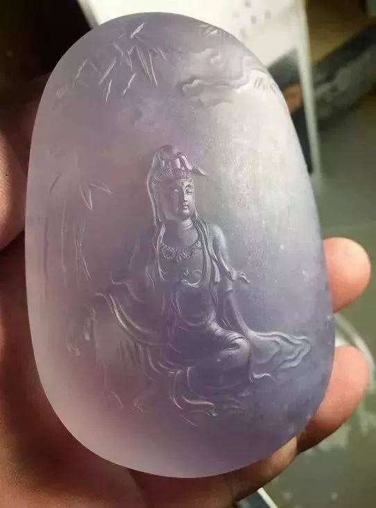 一塊切大漲的冰種紫羅蘭雪花棉片料, 準備雕刻竹林觀音掛件。