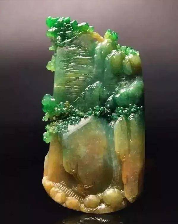 背面的雕琢與正面渾然一體,圖案雕琢過渡自然,脆綠俏為樹木茂盛的山林,黃翡變作峻俏崎嶇的岩石,部底一條小溪順著小路流到前景,洋溢著寧靜安詳的禪意。