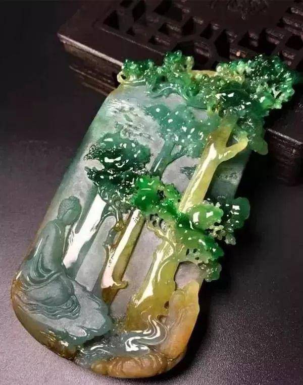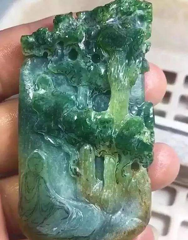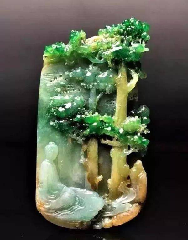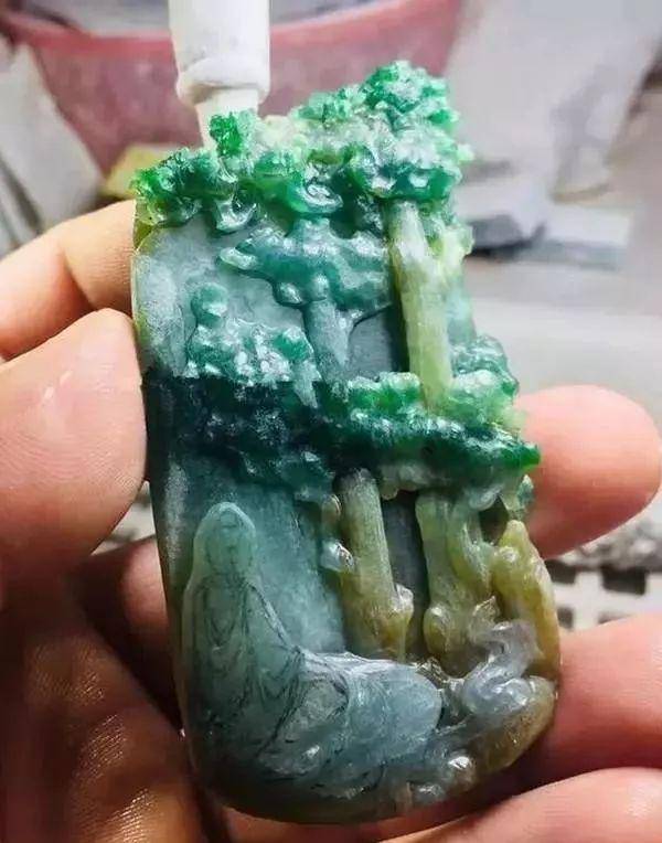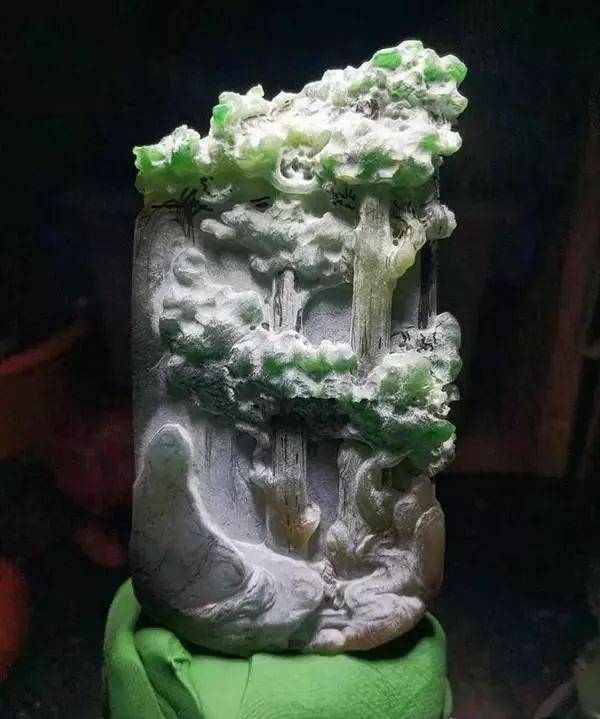 重浮雕打出來的粗胚,樹木、岩石等形象會非常立體,這樣方便對玉料進行避绺裂。 玉雕師巧妙地用樹葉、樹幹、石縫等去避綢裂,使得綢裂、色彩與圖案渾然一體,出來的作品視覺效果合理自然,肉眼難以辯出瑕疵。