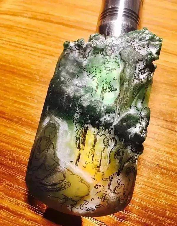 玉雕師分析色彩的分佈,綠色色帶一層一層分佈在玉料上面,黃色主要集中在玉料右下部分,左下部分的玉料相對比較乾淨。 根據經驗,玉雕師構圖了這個《三彩佛祖》的設計:一層一層的綠色俏色設計為蒼鬱的樹葉,黃翡俏色設計為樹幹,在玉料左下乾淨的部分設計佛祖靜心打坐; 玉料底下的绺裂以樹林雜石間流出的小溪避雕。