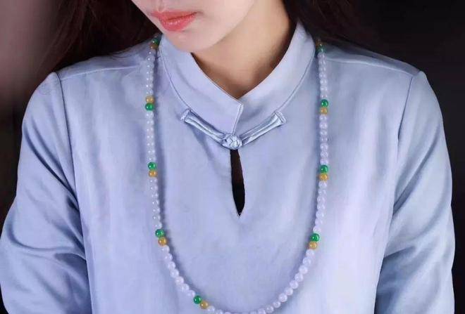 珠鏈顏色的混搭在近幾年也是流行趨勢之一,用不同顏色的翡翠珠子串成珠鏈,更顯時尚俏皮,這種珠鏈對每顆翡翠珠子的種水、色度要求不像傳統珠鏈那樣苛刻,相比之下價格也更加親民,是以很受時下年輕人的喜愛。 不管你是走韓系清純風、還是日系萌范兒,都能找到最適合自己的翡翠珠鏈。