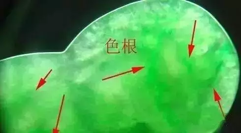 染色的翡翠的色根呈絲狀,色邊緣分層模糊,分佈不均,過渡不自然,從外看有色浮。 不過不是所有的翡翠都有色根,比如如龍石種,芙蓉種翡翠、滿綠高檔的老坑玻璃種翡翠的顏色非常均勻,顏色跟底色幾乎一樣,所以是看不到色根的。 此外,種水好的翡翠,色根擴散明顯,結構細密,精緻剔透。