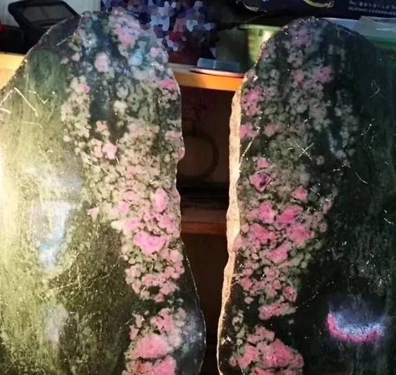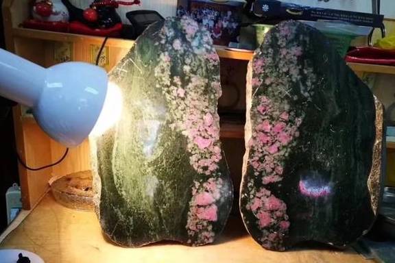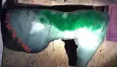 有看出來是什麼嗎? 是不是有點像骷顱頭? 太難找了…… 既然從外觀很難發現奇石,那麼切開的翡翠會不會發現奇石呢? 驚喜還真的有,我們都見過桃花開在樹上,但沒見過桃花開在翡翠里吧,當桃花開在翡翠里,算不算奇石呢? 就是下面這塊。