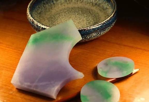 這樣的料叫春帶彩,什麼是春帶彩呢? 彩為紫,春為綠。 春帶彩就是一塊翡翠上有紫有綠。