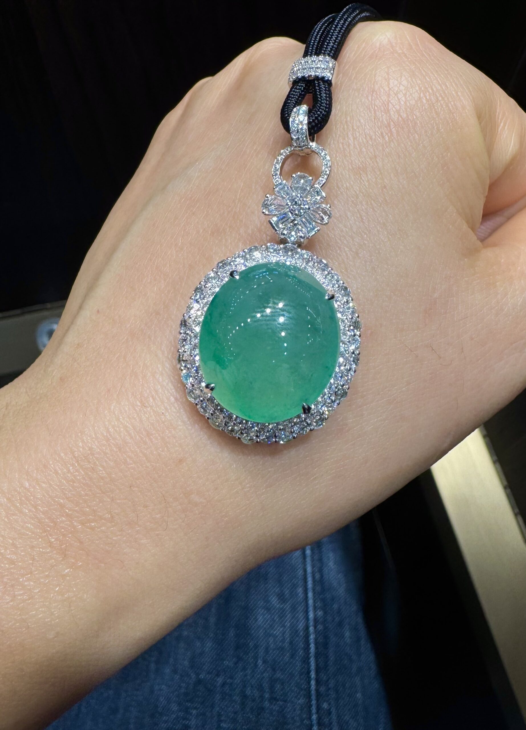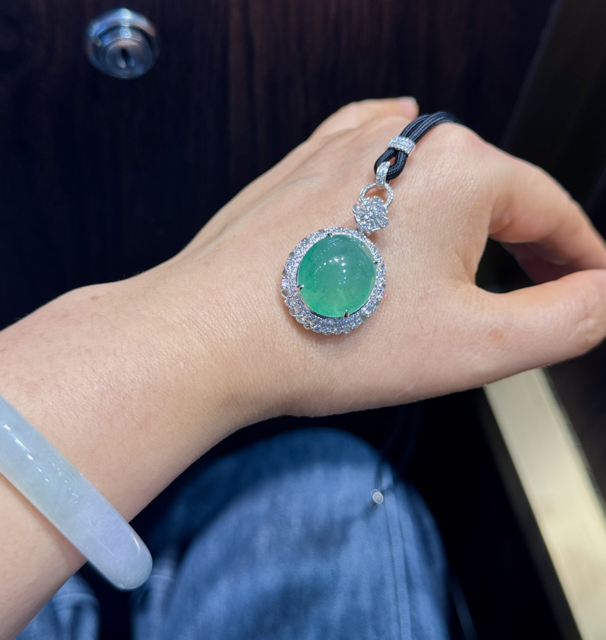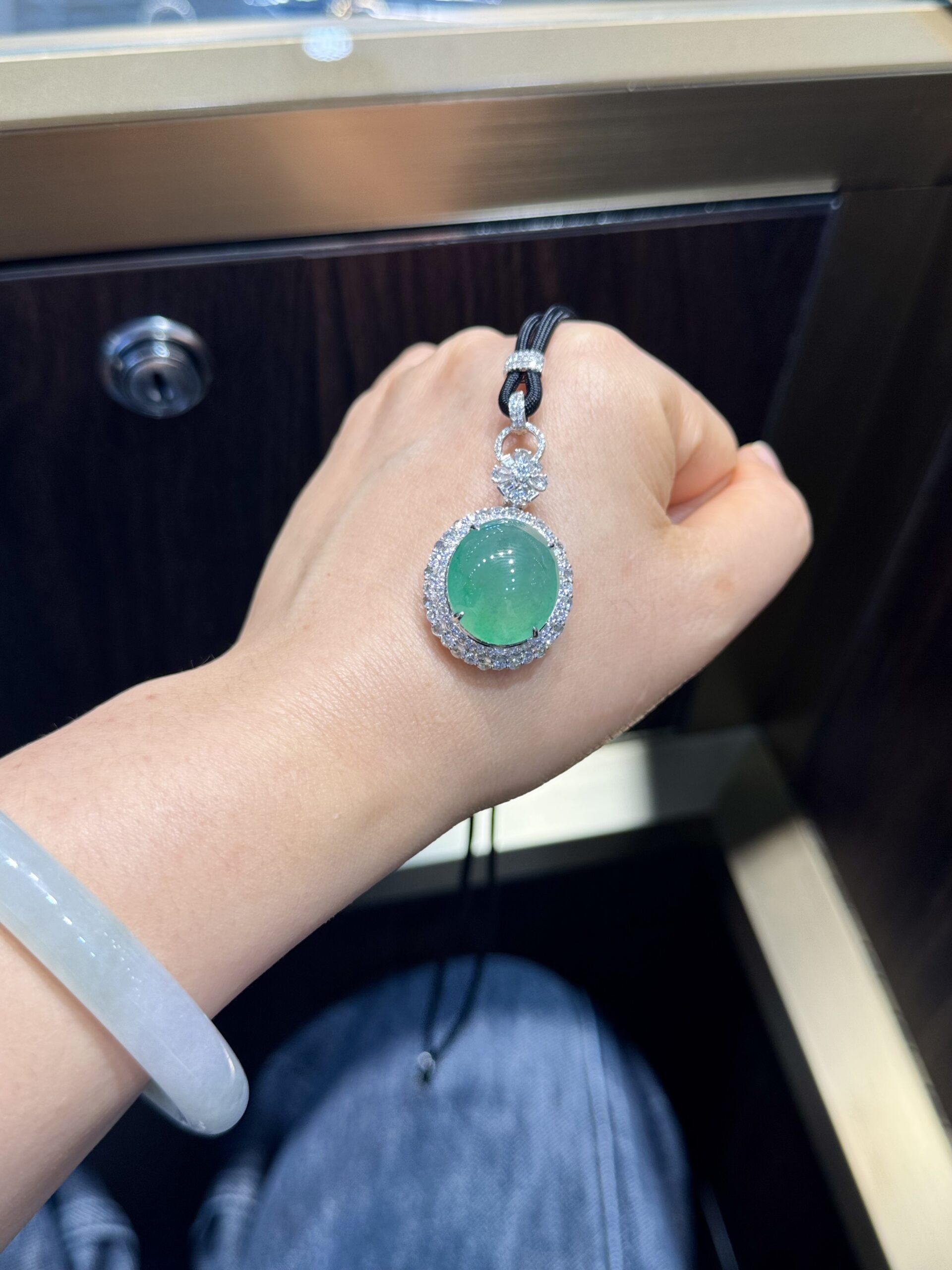 天然緬料冰種湖水綠大冰蛋掛墜,冰透水潤起光,清爽靈動的湖水綠,18K金天然鑽石精工鑲嵌,裸石:18.9*16.3*13mm,整體尺寸:33*20.5*13mm 中萬,實物種色更好 價格:65000