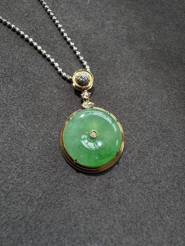 天然緬料冰糯種翡翠陽綠平安扣飾品,平安扣底子細膩水潤,辣綠色。18K金天然鑽石鑲嵌。款式簡約百搭,低調的精緻。裸石:18.1*3mm,整體:32*18.1*7.5mm
