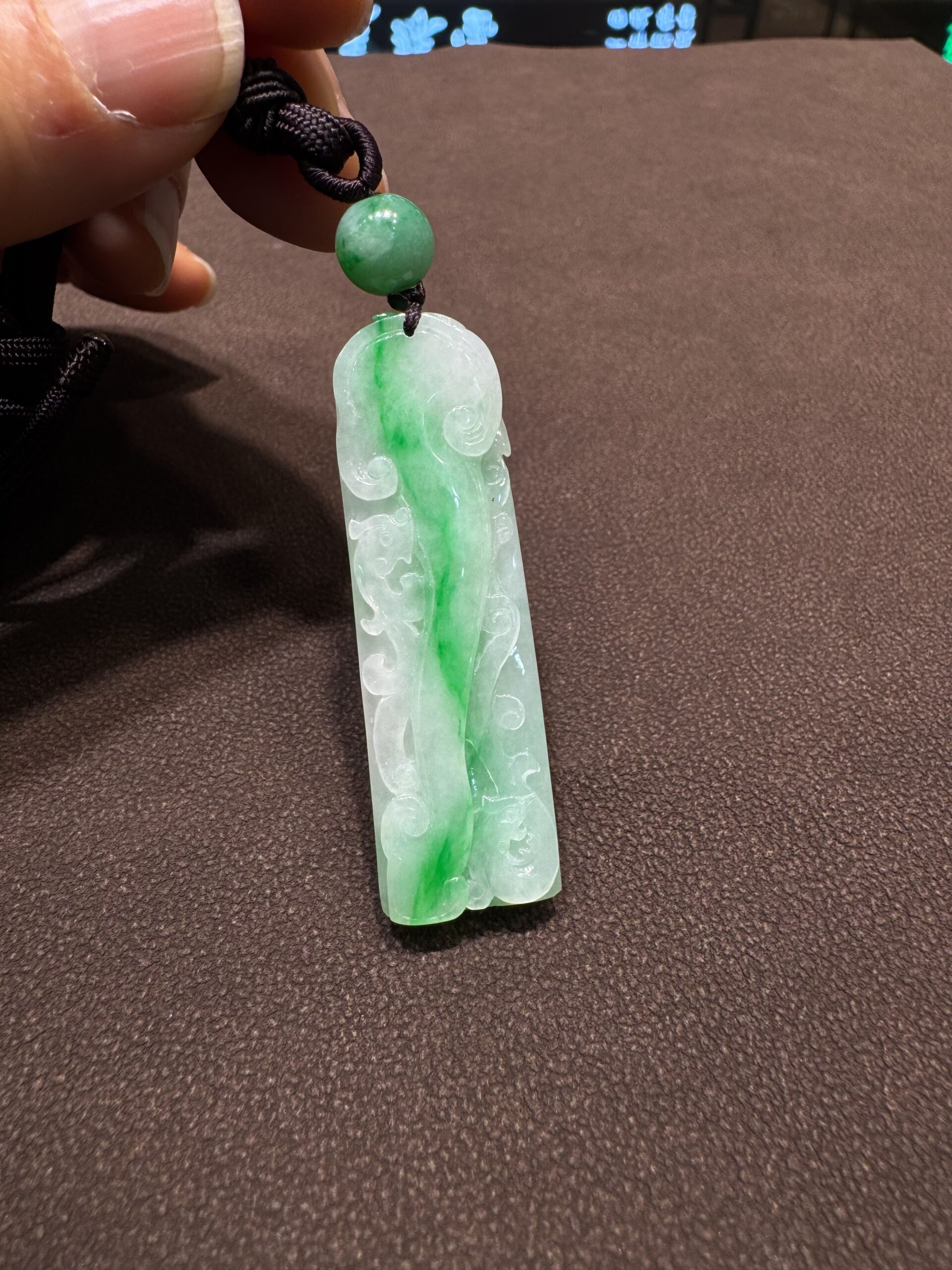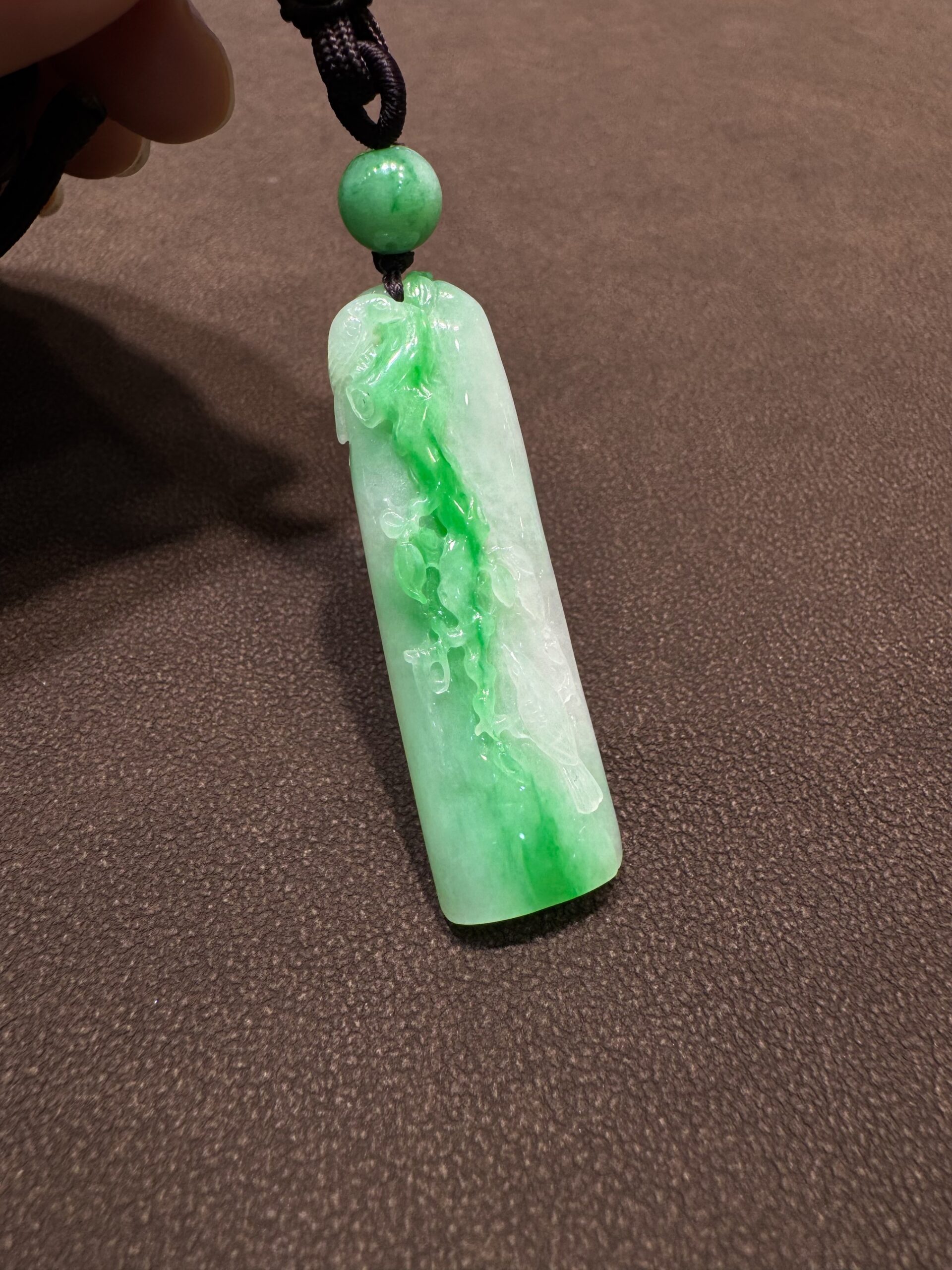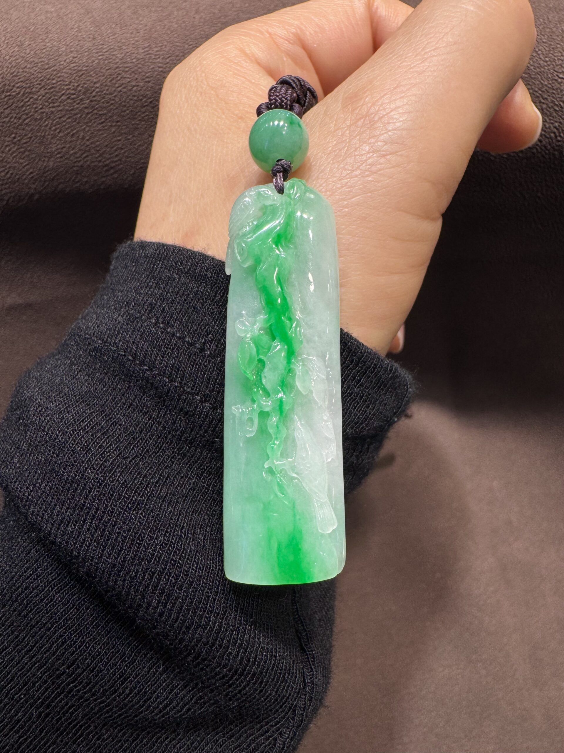 天然緬料細糯種飄陽綠翡翠巧雕喜上眉梢牌子,立體巧雕,工藝栩栩如生,極具活力的陽綠色,讓整個牌子非常生動有靈氣。裸石尺寸:51*18.9*6.5mm