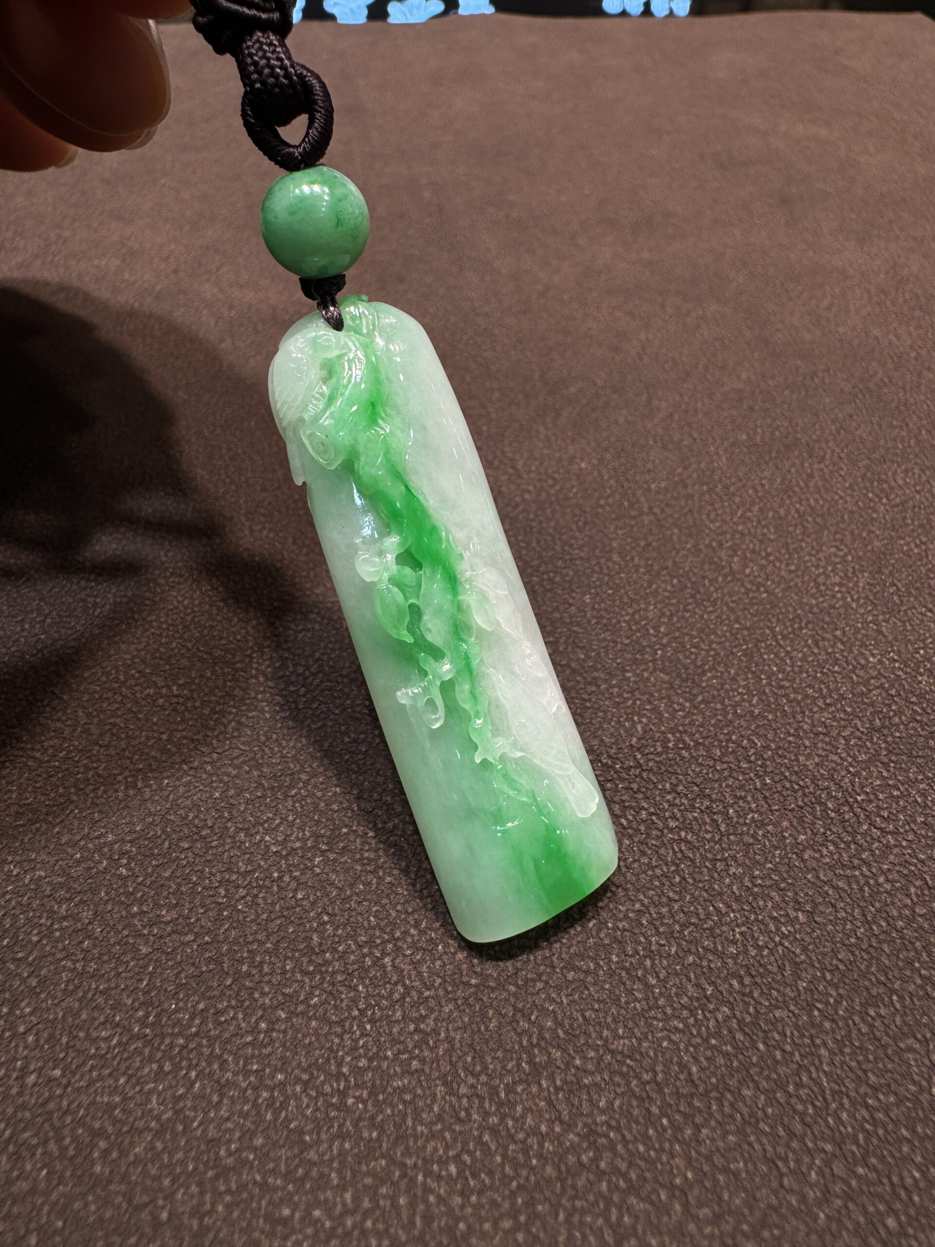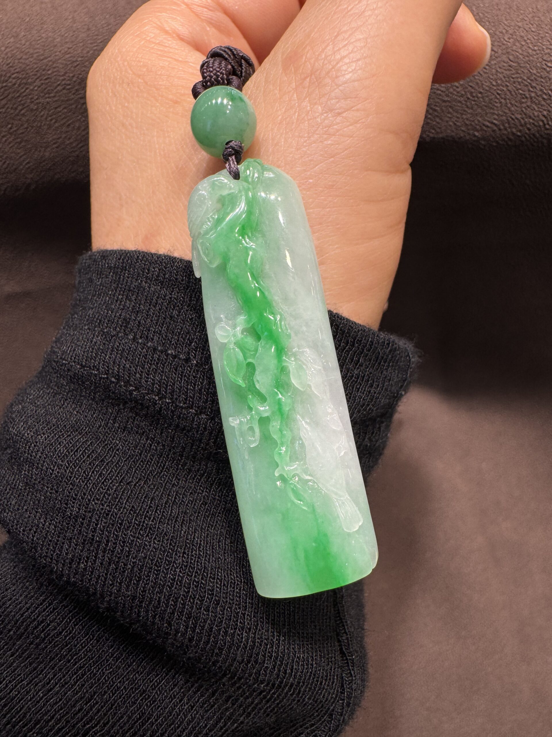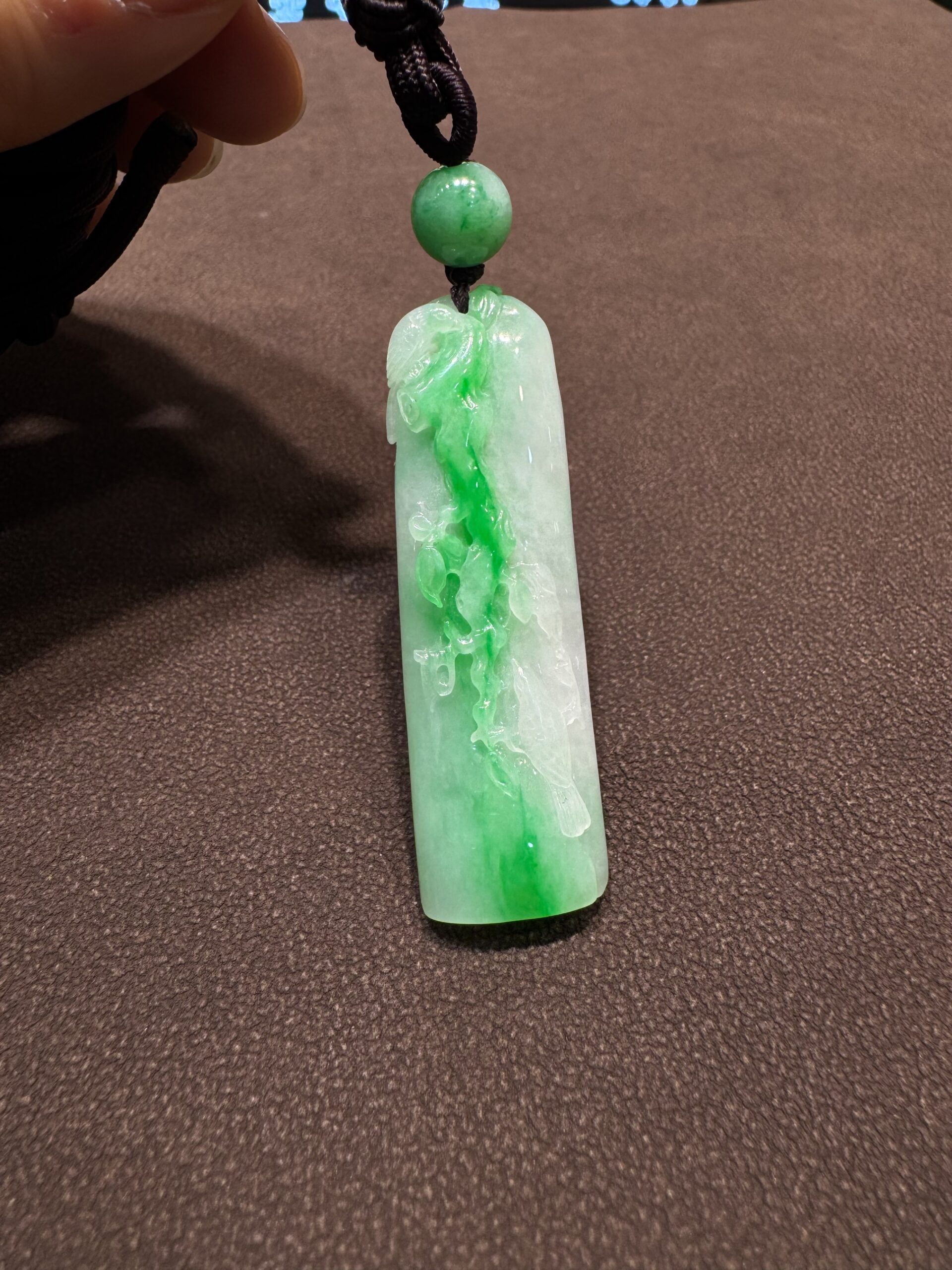 天然緬料細糯種飄陽綠翡翠巧雕喜上眉梢牌子,立體巧雕,工藝栩栩如生,極具活力的陽綠色,讓整個牌子非常生動有靈氣。裸石尺寸:51*18.9*6.5mm