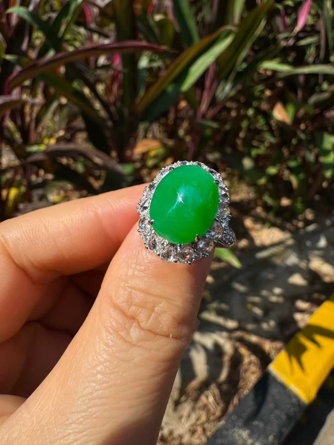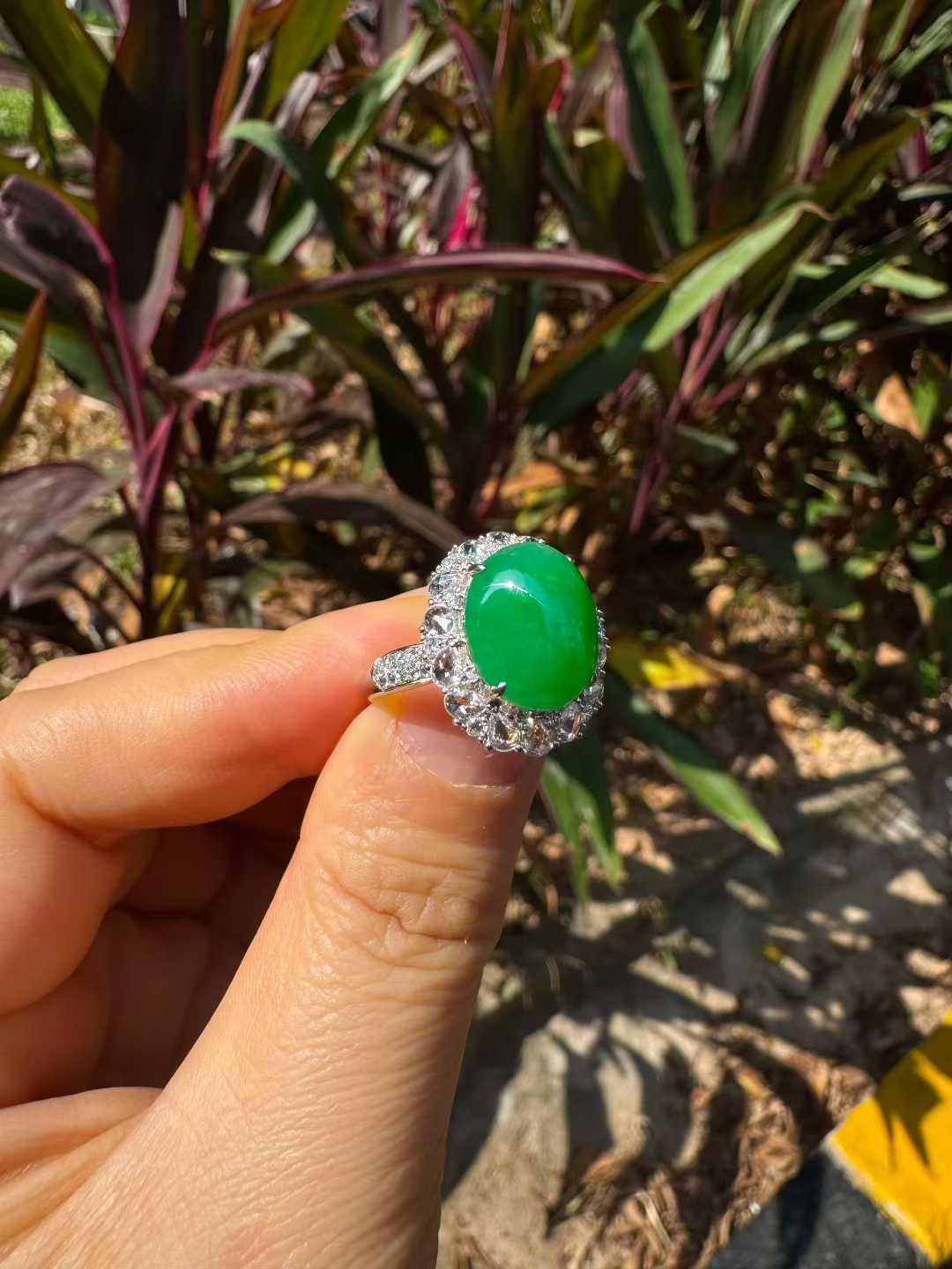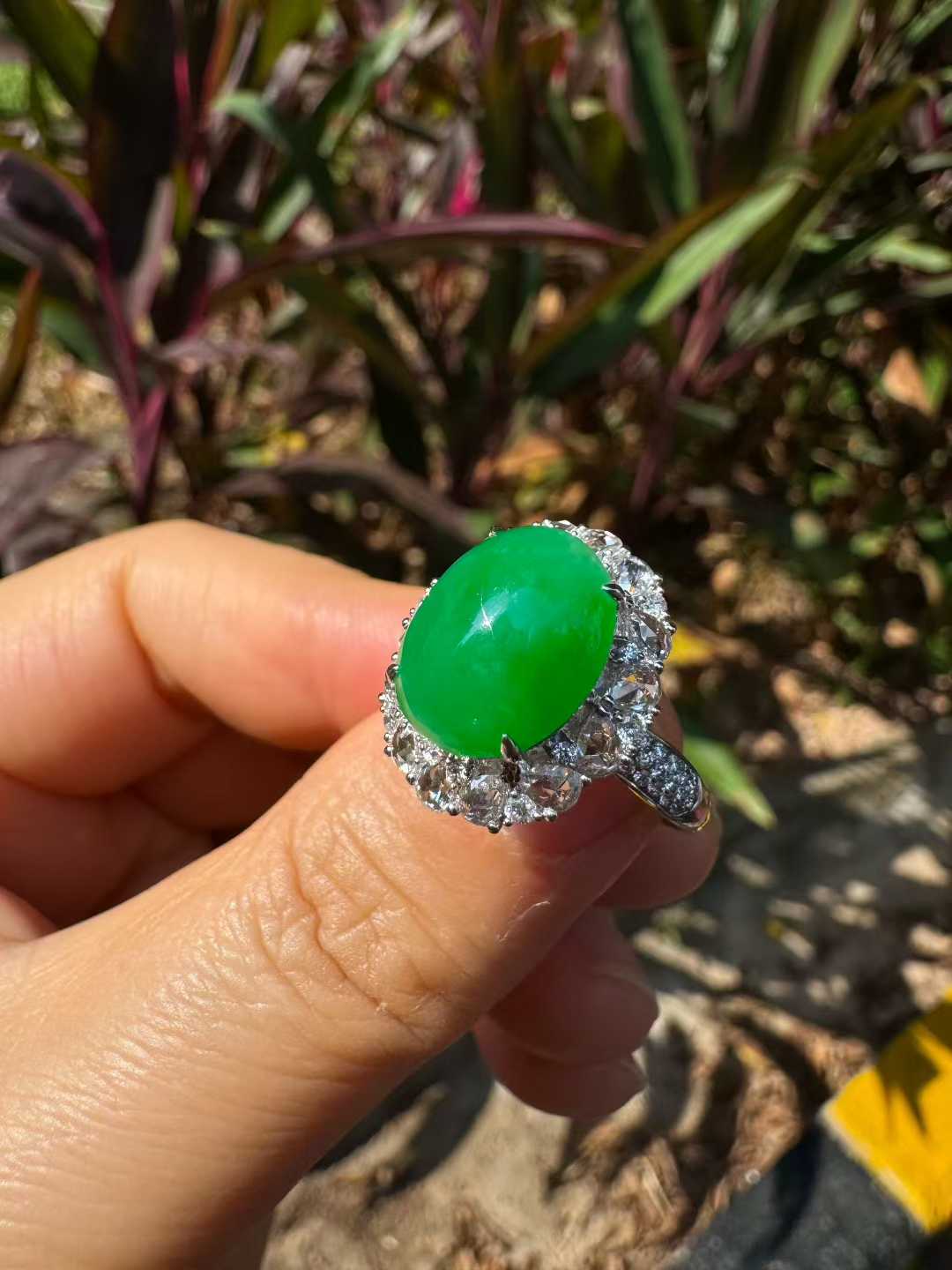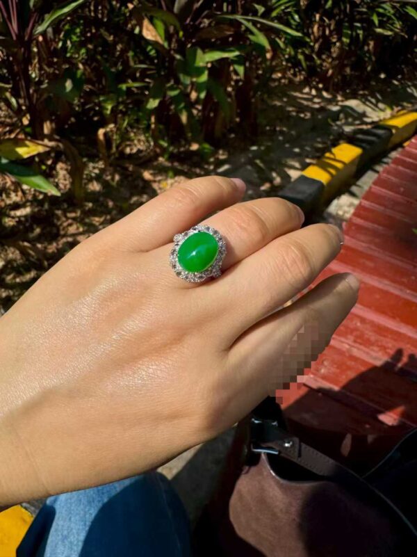 天然 A 货缅甸翡翠戒指 帝王绿高冰种蛋面 18K 金镶满钻