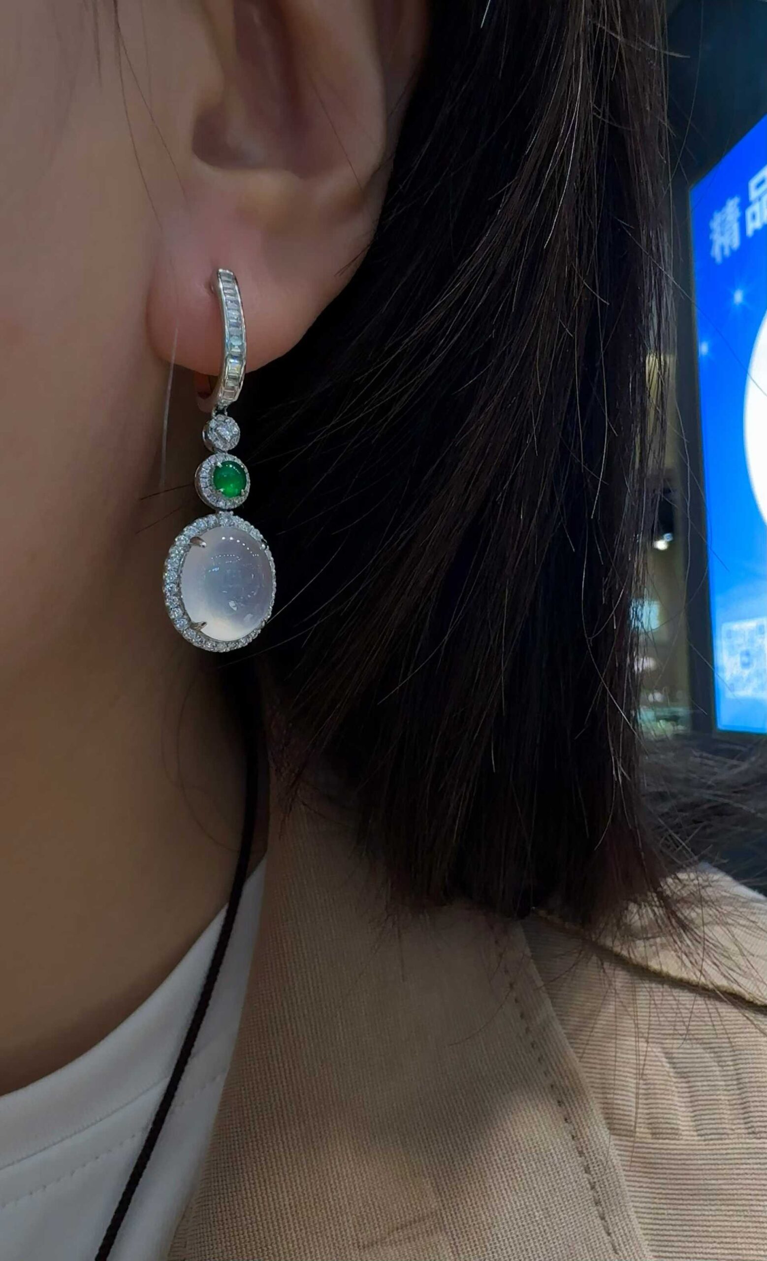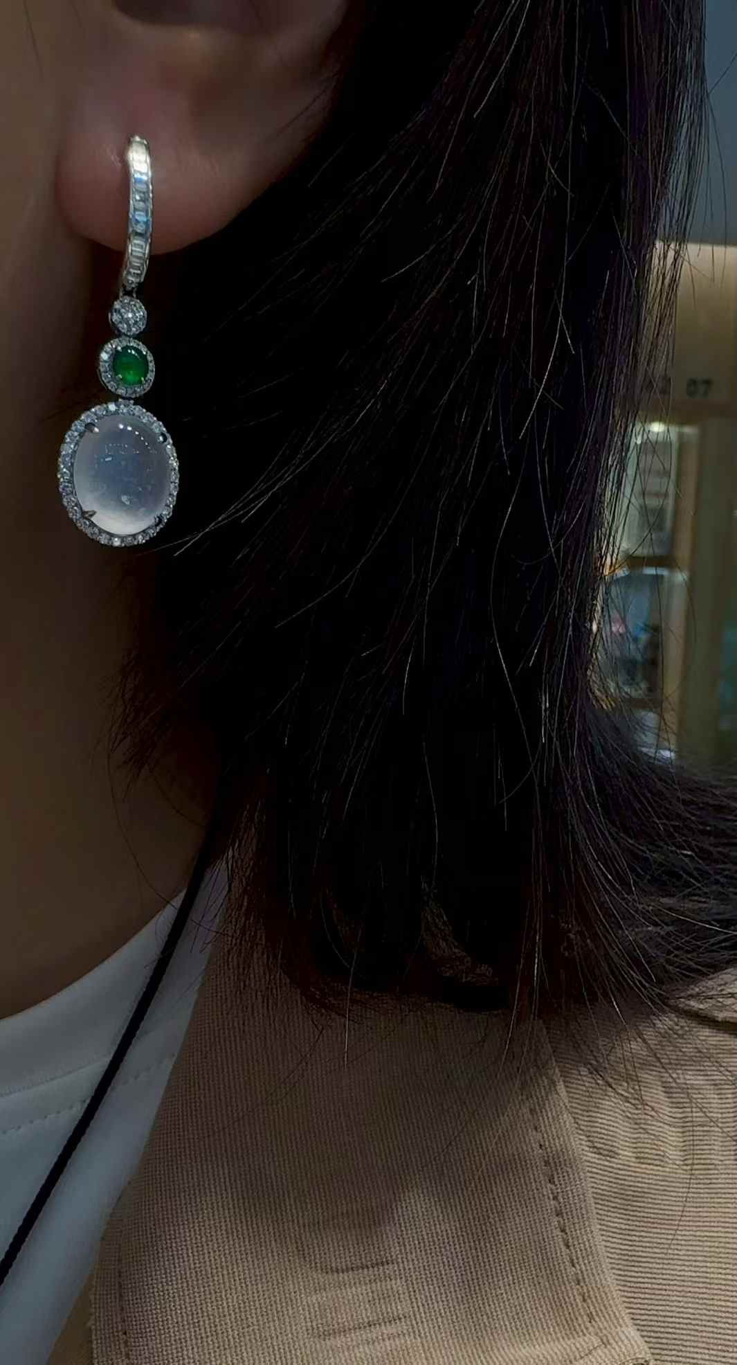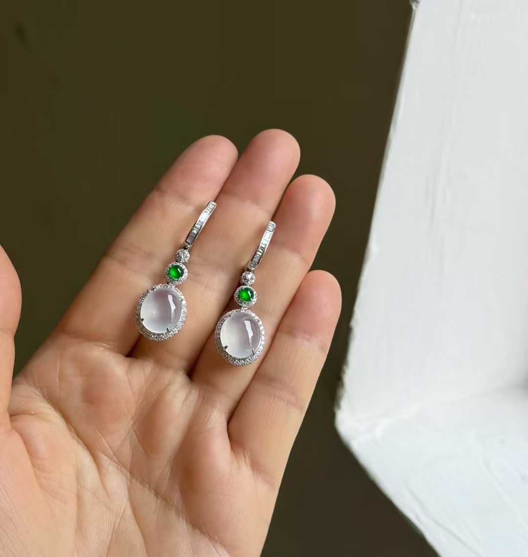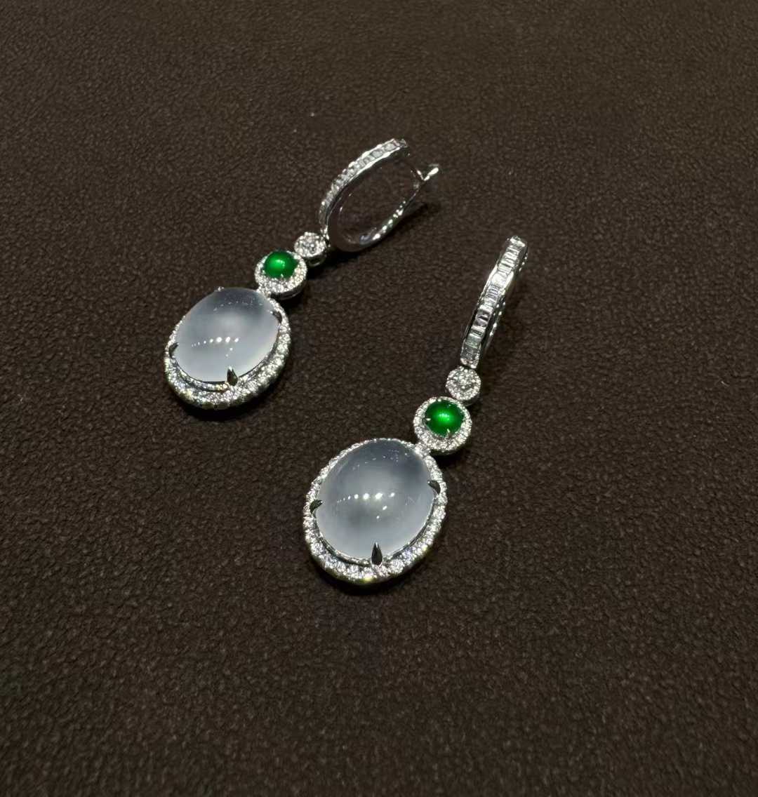 天然A貨緬甸翡翠耳墜 高冰白冰蛋面 18K金鑲鑽 辣綠配石耳飾女送禮